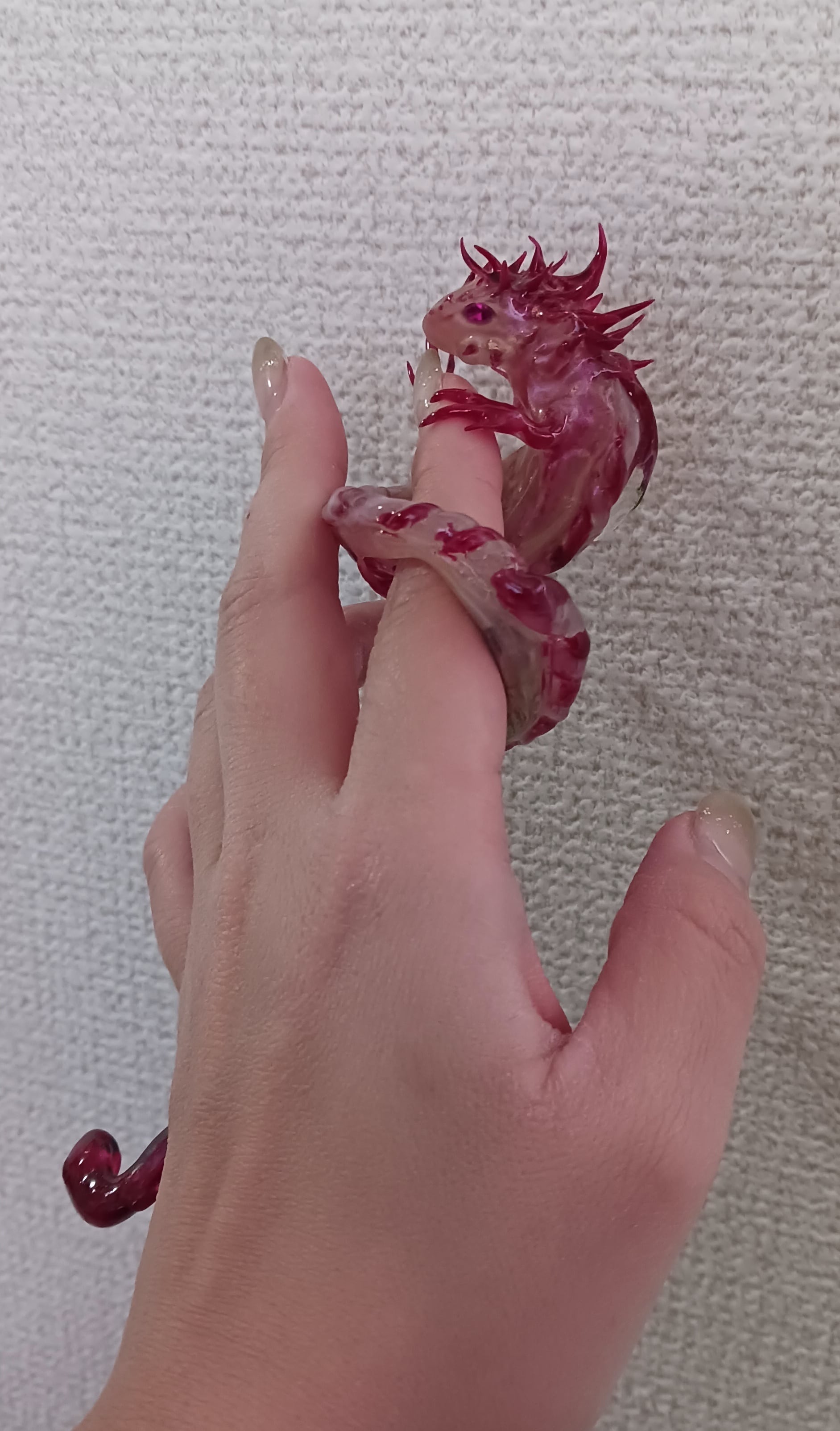 背中にスワロフスキーのクリスタルを秘めた紅白の美しいドラゴンは少しツンデレ。
